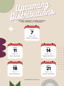 two distributions in the month of November in an effort to reach more families who need a little extra help this month. Through generous financial contributions from community members and businesses, volunteer support from local churches, and canned food drives from student groups, the Heard County community is coming together to support our neighbors in need. Here’s how you can help: